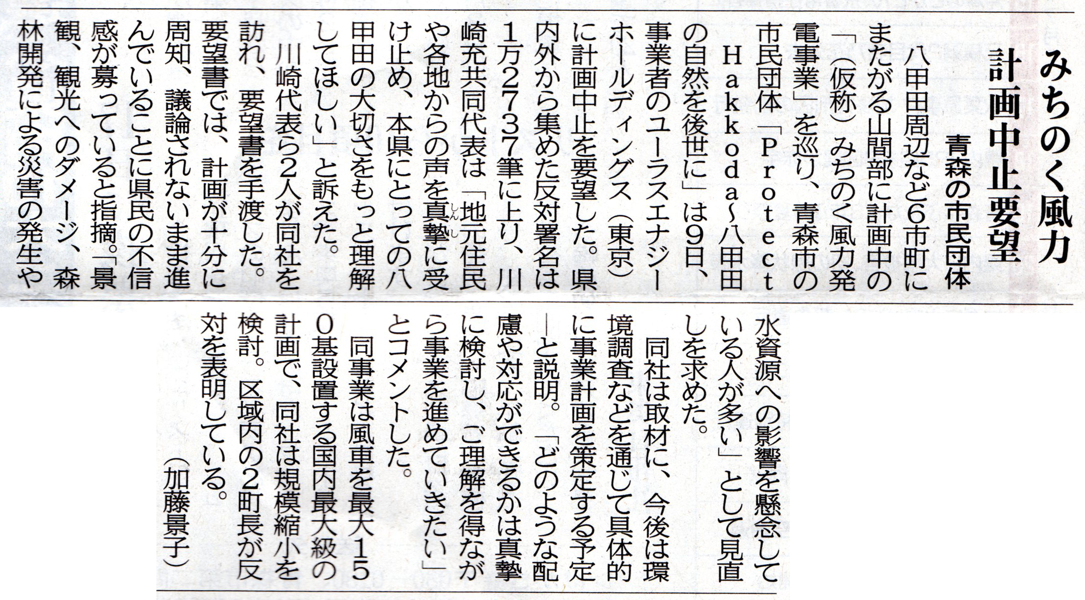 (仮称)みちのく風力発電事業の取りやめについて