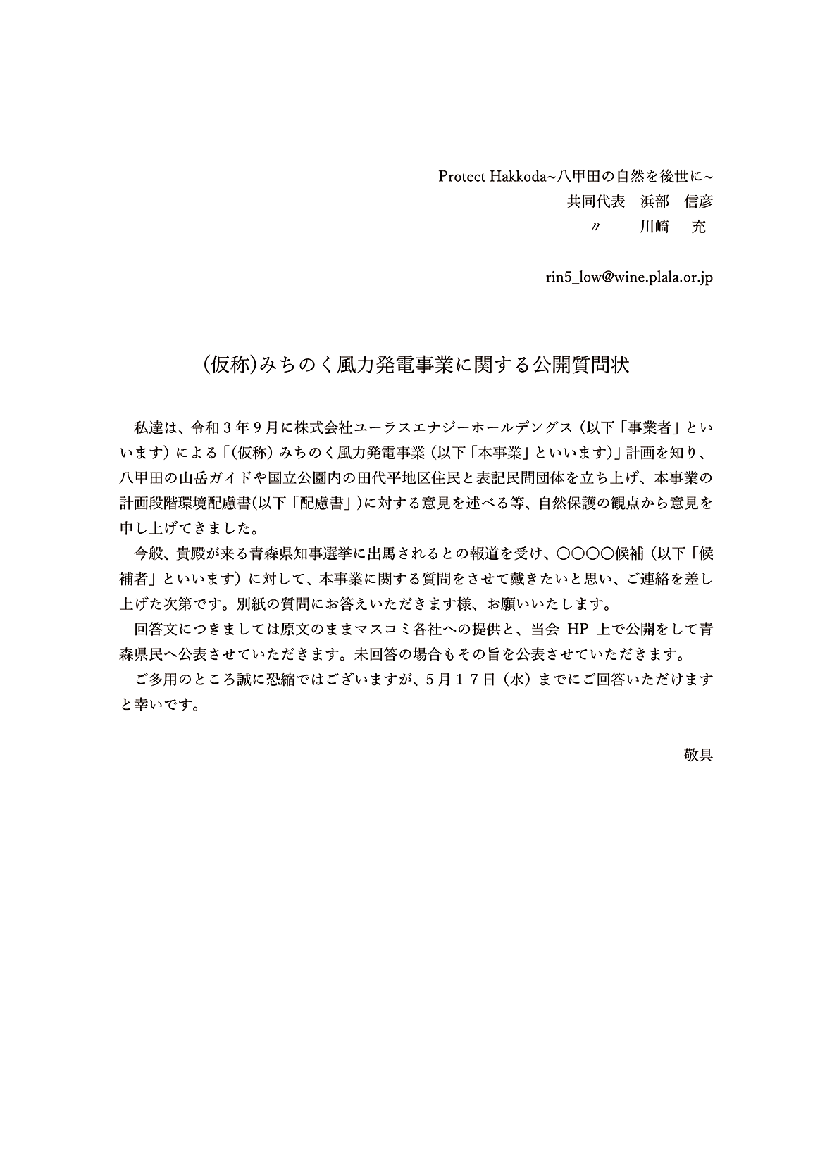 「公開質問状」の回答をお願いしました。